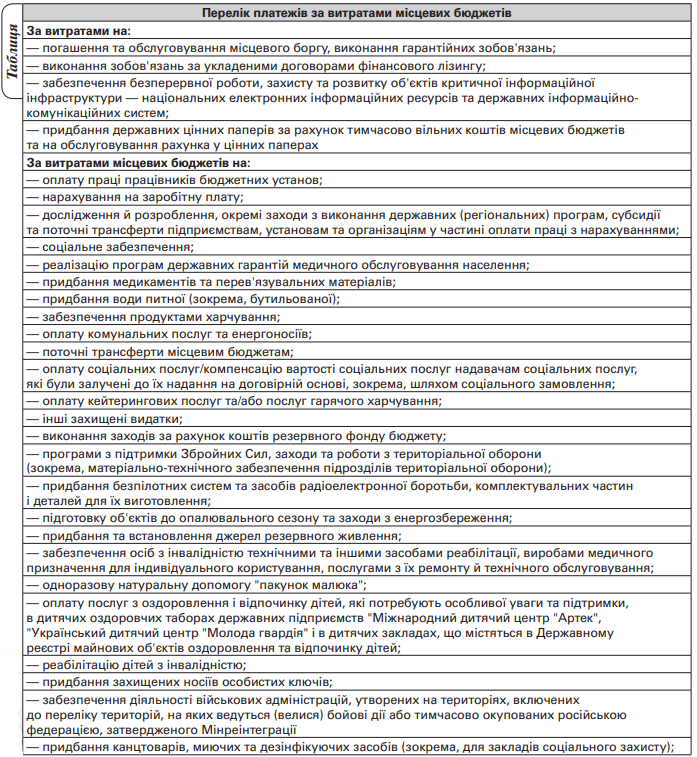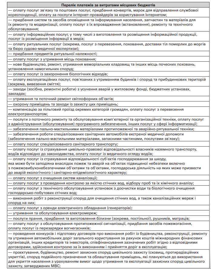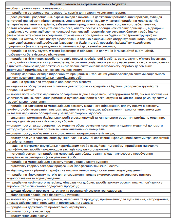 У таблиці узагальнено платежі за витратами місцевих бюджетів, які увійшли до цього переліку.