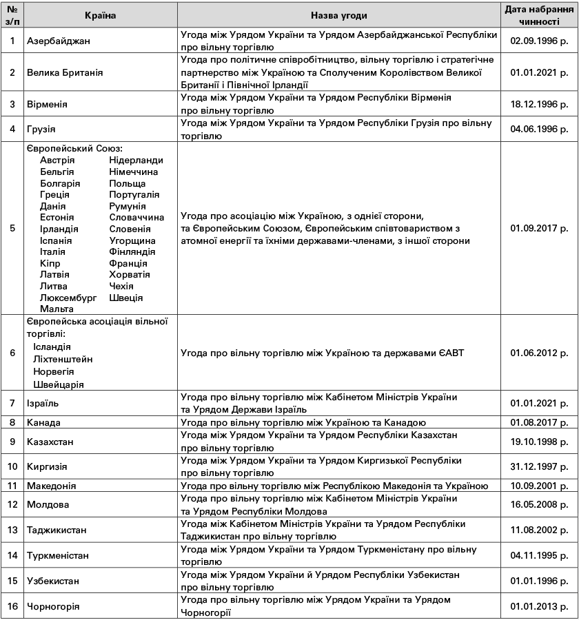 Якщо зупинити пересічного українця посеред вулиці і спитати, з якими країнами Україна має угоди про вільну торгівлю, то в кращому разі можна почути про Євросоюз та/чи Канаду. Але насправді країн, з якими укладено подібні угоди, понад 40! Для підтримки вашого експортного бізнесу наводимо перелік країн, з якими торгівля — вільна. Тексти угод із ними доступні на сайті газети “Все про бухгалтерський облік” за посиланням: document.vobu.ua/korysne/dovid/freetrade.