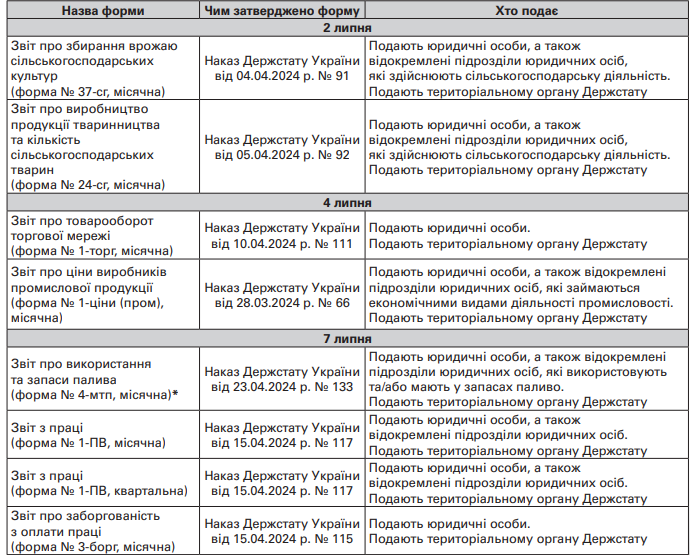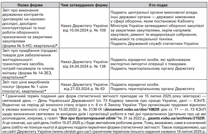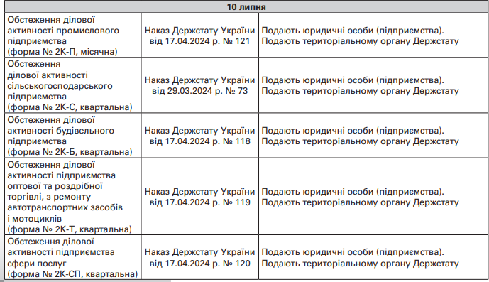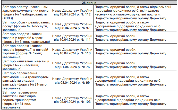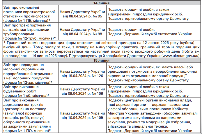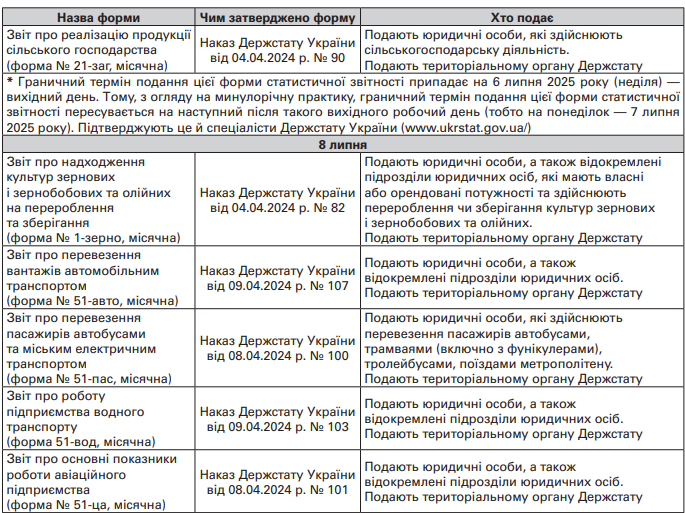 Календар подання статистичної звітності у ЛИПНІ 2025 року