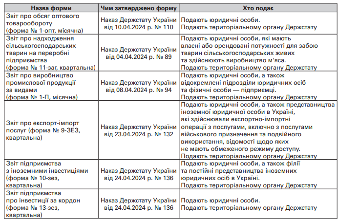 Нагадаємо, що наразі статистичну та фінансову звітність у документарній та/або електронній формі дозволено подавати (за весь період її ненадання) до органів статистики протягом трьох місяців після припинення чи скасування воєнного стану або стану війни (пп. 1 п. 1 Закону України “Про захист інтересів суб’єктів подання звітності у період воєнного стану або стану війни” від 03.03.2022 р. № 2115-IX). Детально про це ми розповідали в газеті “Все про бухгалтерський облік” № 24 за 2022 р. Утім, якщо у підприємства є можливість, то краще, звісно, не тягти кота за хвоста, і подати статистичну звітність у законодавчо встановлені строки, аби була можливість забезпечувати необхідною інформацією суспільство та державу (наголошували на цьому і працівники Держстату). Саме їх ми далі й наведемо.